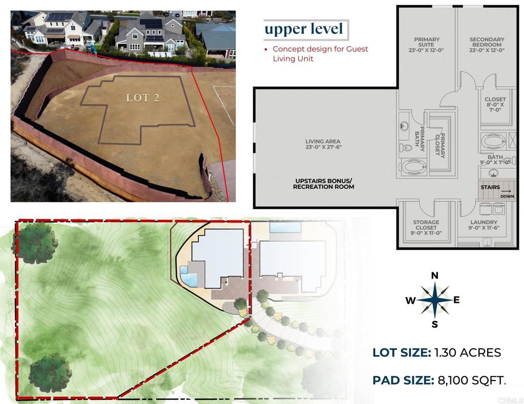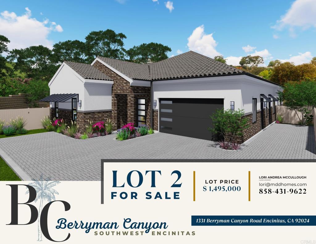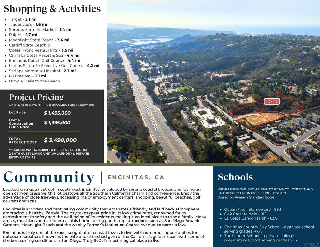 Southwest Encinitas lot fully graded and permit ready! This 1.30 acre lot is secluded above a canyon and ideally positioned to take advantage of panoramic views of dramatic vistas of rugged canyons and rolling hills. The location is perfect, just minutes from the I-5 freeway, shopping, cafes and restaurants, surfing, biking and miles of hiking trails, making this lot a superior place to call home. This fully improved lot is permit ready as MDD Homes has pre-designed (fully approved) a beautiful 5400 sq. ft. classic showpiece that allows for multi-generational living at its best with the first floor living (3146 sq. ft.) having 3 bedrooms, 2.5 bathrooms, gourmet kitchen, cafe dining, family room, large walk in pantry and 2 car garage. As a bonus the permitted upper level (1824 sq. ft.) is a dream come true as you can decide too add more bedrooms and bathrooms, keep as a recreational area or within your own desired timeline build out a 1200 sq. ft. A.D.U. which is the allowed sq. footage for an A.D.U. in City of Encinitas. Top schools, Encinitas Union Elementary and San Dieguito Union High, just down the street from Encinitas Country Day and The Grauer school a private and preparatory school.