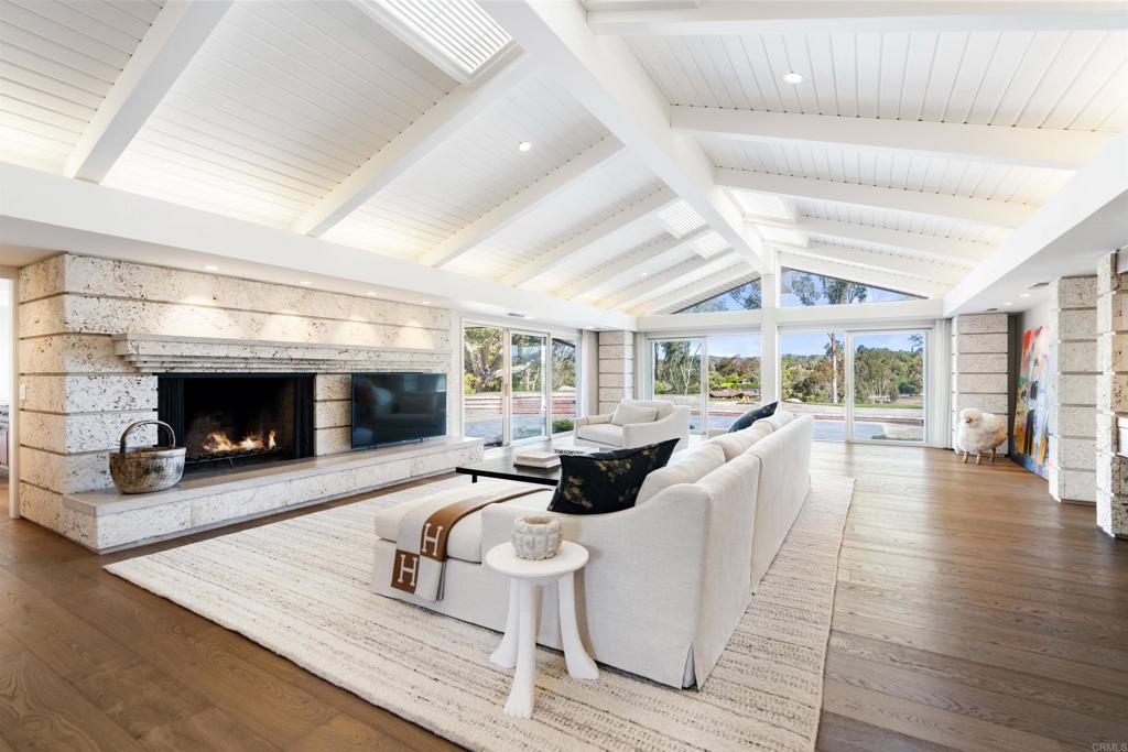 Tucked along one of the Covenant's most desirable west-side streets in Rancho Santa Fe, this beautifully single-level estate blends timeless sophistication with serene golf course views. Set on 4.5 acres of lush, mature landscaping, the home spans approximately 6,900 square feet of warm, contemporary-inspired interiors designed for effortless living and elegant entertaining. Inside, five spacious bedrooms, an office, four full baths, and two powder rooms are thoughtfully arranged around inviting gathering spaces. The gourmet kitchen, equipped with top-tier appliances, opens to a light-filled family room featuring dramatic high ceilings with wood detailing, a striking coral stone fireplace, and expansive glass doors that frame breathtaking golf course views. Multiple skylights fill the home with abundant natural light, creating a bright and airy atmosphere throughout. Nearby, a game room and sunroom offer flexible spaces for relaxation or entertaining. The primary suite occupies its own private wing, offering a luxurious retreat complete with a fireplace, wet bar, spa-like bath with steam shower, and dual dressing rooms. A secondary bedroom is conveniently located next to the primary suite--ideal for a nursery, gym, or additional office. On the opposite side of the home, three additional bedroom suites provide comfort and privacy for family or guests. Outdoors, the property lives like a private resort with a sparkling pool and spa, tranquil water feature, built-in BBQ, and expansive lawns surrounded by nature. The estate also includes owned solar, two detached storage buildings, a three-car garage, and a private gate. Just moments from the Covenant's scenic trails, village shops and dining, golf and tennis clubs, and the acclaimed Roger Rowe School, this exceptional property captures the very best of Rancho Santa Fe living -- refined, relaxed, and effortlessly elegant.