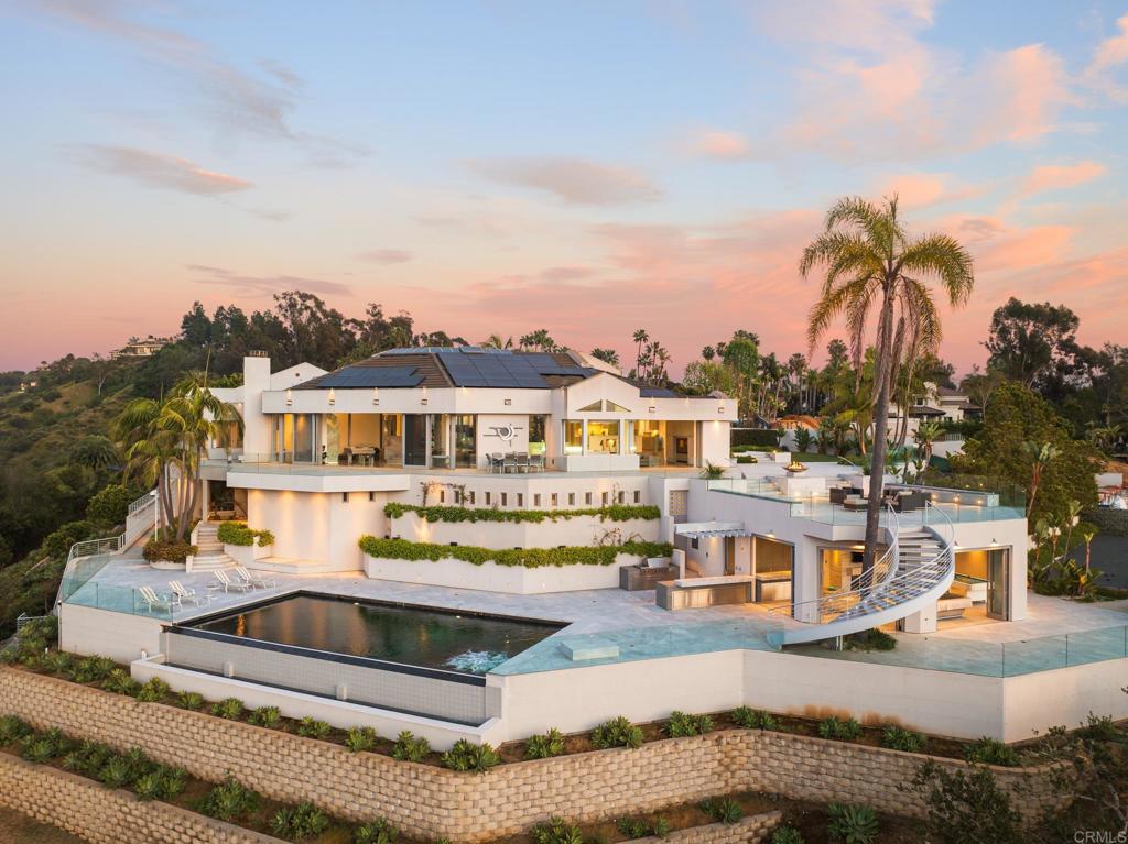 This stunning remodeled estate is perched atop a 1.28 acre elevated lot on a quiet cul-de-sac in the sought-out gated community of Fairbanks Ranch! Enjoy breakfast in the upgraded gourmet kitchen or relax by the Pool/Spa in the backyard overlooking peaceful hills and greenery! Owned solar panels fully power the property, gated driveway for added privacy and an outdoor kitchen perfect for entertaining. With it's exercise room and 3rd floor bonus room, this home is an absolute winner! [Supplement]: All upstairs bedroom suites have been fully remodeled to reflect a modern touch. The luxurious white quartz counter tops add elegance to the gourmet kitchen. New designer carpet has been added to the 2nd floor for a clean chic look. The newer 8 3/4" plank, matte finish hardwood flooring on the bottom floor make it easier to decorate the home as you please. The house interior has been repainted to look like new. On the outside, the entire home exterior and retainer walls have been newly repainted making the home look fresh and clean. Pool & Spa have been re-plastered, and the surrounding area repaved and ready to entertain guests. Newly restored roof tiles for those seldom San Diego rainy days. Landscape has been upgraded with new plants to add to the already lush surrounding. Solar panels that power the entire house and appliances, as well as the electric car charging station in the 4 car garage, will save you a significant amount of money. With award winning schools nearby for your kids to thrive in, this home also includes community parks, lakes, and country clubs for your enjoym